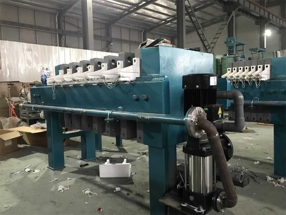 泵機一體式板框壓濾機,是進料泵和壓濾機直接管道連接好的便捷壓濾機。優點是客戶安裝方便,節省現場空間,過濾速度快、泥餅含水率低。